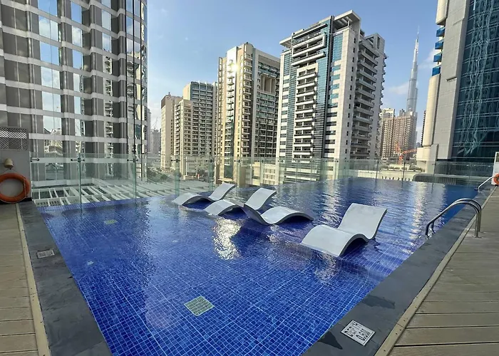 Stylish Studio Bayz Danube Burj Khalifa View Pool Dubaï de 38 m^2 est situé à moins de 3 km de la Zone d'activités Emaar Square et à moins de 6 km du Stade Zabeel. De plus, l'accès à une piscine à débordement garantit aux clients un séjour relaxant.